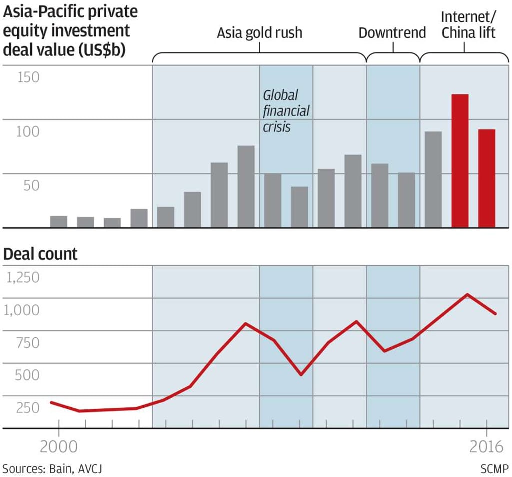 The momentum of private equity investments had already slowed in Asia-Pacific as deal value dropped to US$92 billion last year from the 2015 record of US$124 billion, Bain said. It was still deemed resilient – the second-best year on record though. Deal volume dropped to 892 after peaking at more than 1,000 in 2015, Bain said.