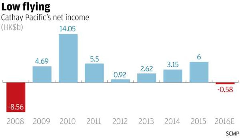 This year “is going to be a difficult year and current trends won’t stop,” chief operating officer Rupert Hogg said in an interview after the carrier’s 2016 loss of HK$575 million, a shocking contrast to the HK$369 million profit expected in a Bloomberg survey of 18 analysts. Revenue fell 9 per cent to HK$92.75 billion.