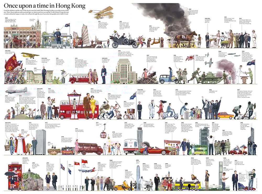 From the rickshaws and the start of the electric tram, the South China Morning Post has covered the stories of this city. There's been typhoons and the occasional tiger, revolution and riots, war and the World of Suzie Wong, skyscrapers and stock market surges, to name a few. Here, they are seen through the eyes of our senior infographic artist Adolfo Arranz.