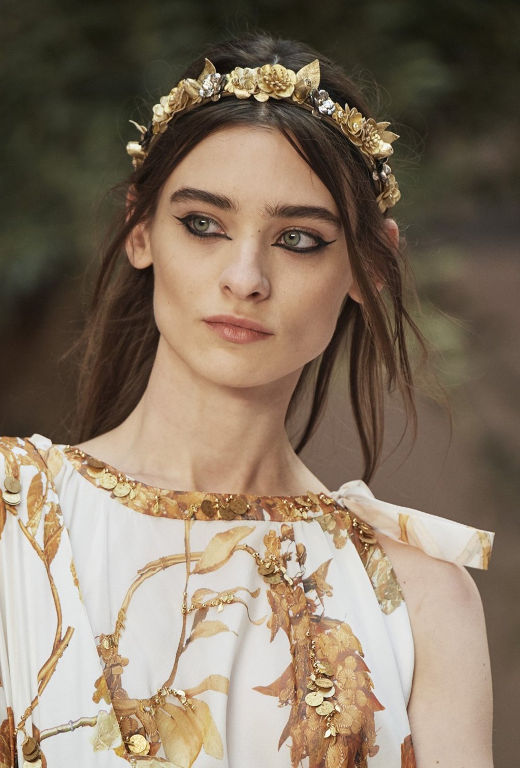 The little things are not overlooked. From the buttons engraved with owls, the prints with laurel crowns, the oak leaves with hidden camellias, the laurel branches arched into elegant double-Cs logo, to Gabrielle Chanel’s favourite wheat stalks that embellish the coins adorning an evening bag, these symbols complete the elegant and mythical collection.