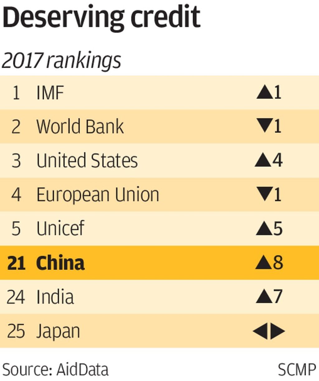 Since US-based AidData conducted its last survey of influential global foreign aid donors in 2014, China moved up from 29th (out of 33) to 21st (out of 35), according to the report, “Listening to Leaders 2018”, released on Thursday.