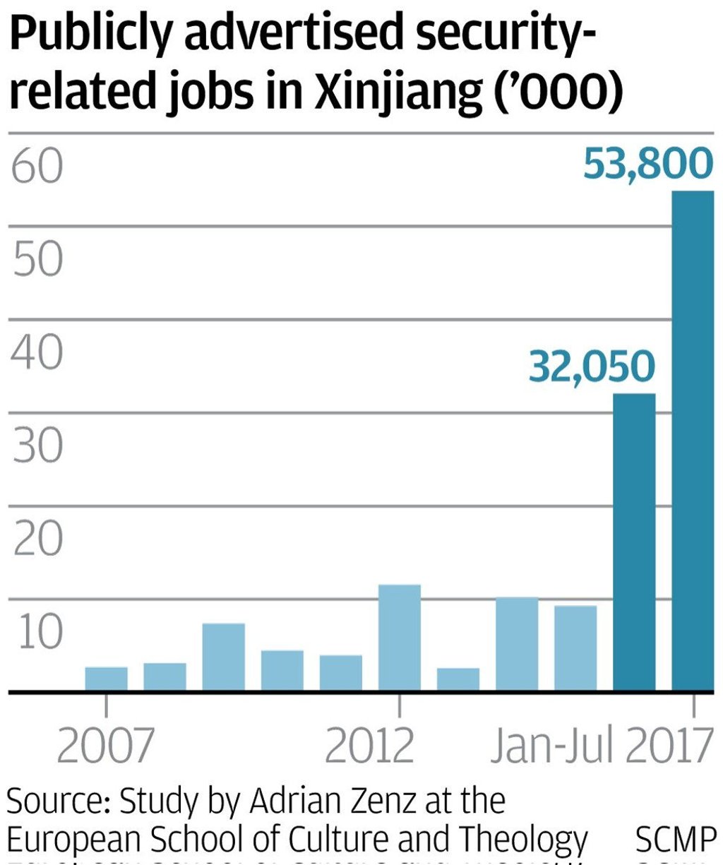 Uygur heartland has advertised more than 84,000 security-related positions since September 2016, nearly 50 per cent more than it did in the past 10 years