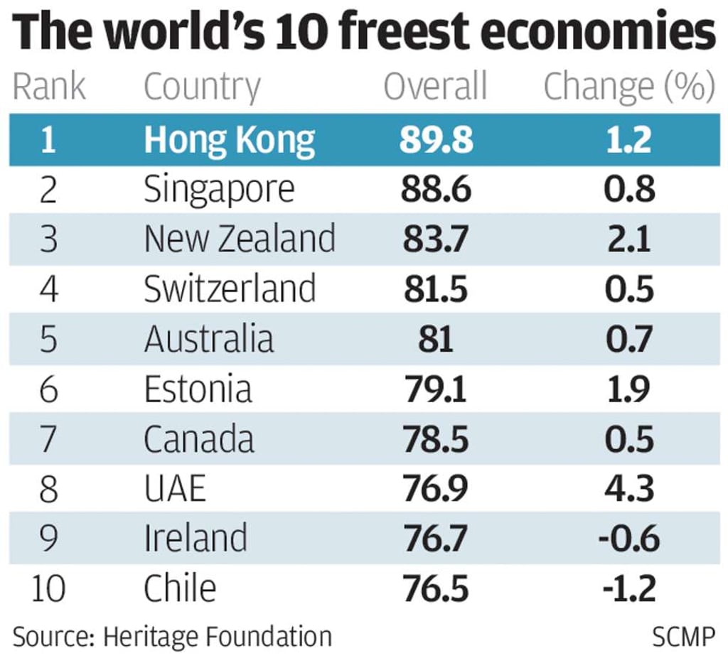 The city scored 89.8 out of 100 points in the annual index of economic freedom compiled by the right-wing Heritage Foundation over 180 economies, up by 1.2 points from last year, beating Singapore by 1.2 points and edging the island nation to second place.