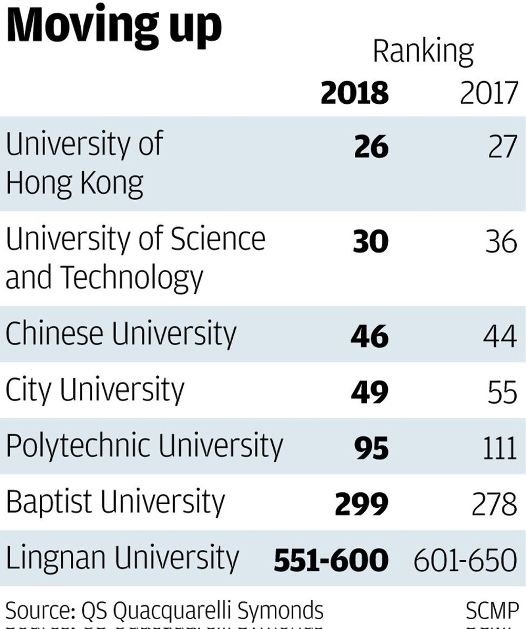 The improvement was based partly on the institutions’ high level of internationalisation, which mainly resulted from mainland Chinese academics working in Hong Kong, according to education information firm Quacquarelli Symonds, which compiled the list.
