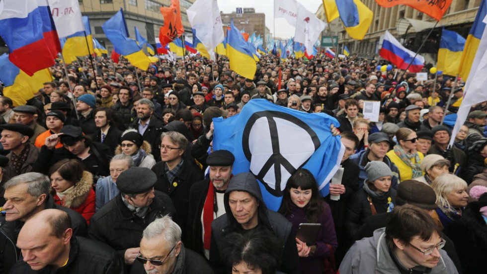 In Moscow, tens of thousands of anti-government protesters marched in protest at Russia's intervention in Ukraine.
