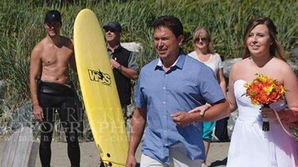 A Vancouver Island wedding photographer, Marnie Recker, tweeted the photo of Trudeau on Saturday with his surf board standing several metres away from the bride, generating plenty of retweets and fanfare online.