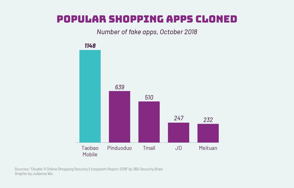 Much like the fake Gucci and Armani goods, fake versions of popular online stores including Taobao, Pinduoduo, and JD have become common across China. The fake Taobao app, for example, was installed on more than 170,000 phones, according to the Double 11 Online Shopping Security Ecosystem Report 2018.