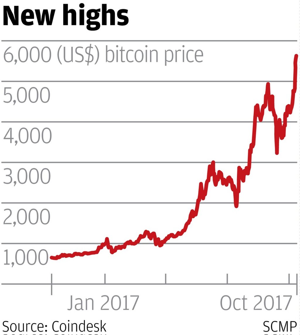 Bitcoin is the best known digital currency, and has become increasingly popular, with investors and governments taking note. The currency hit a record US$5,850 on Friday, surging nearly 25 per cent within the last 30 days, according to data from Coindesk.