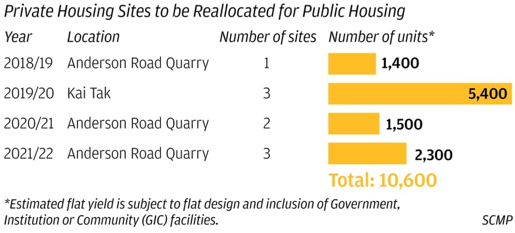 The other sites include two in Kai Tak, and one each in Tuen Mun and Cheung Sha on Lantau Island, Michael Wong Wai-lun, Development Secretary, said on Tuesday.