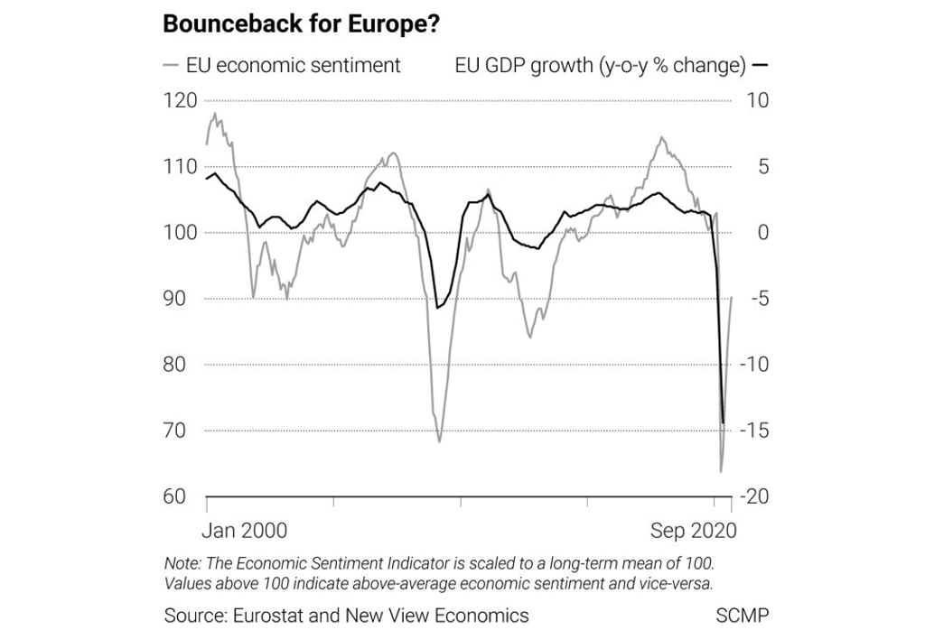 Europe’s confidence indicators are bouncing back, but the big issue is whether recovery is sustainable. Europe’s bellwether economic sentiment indicator rallied from an all-time low of 63.8 in April to 90.2 in September, an encouraging sign for recovery but only as long as there are no further setbacks.