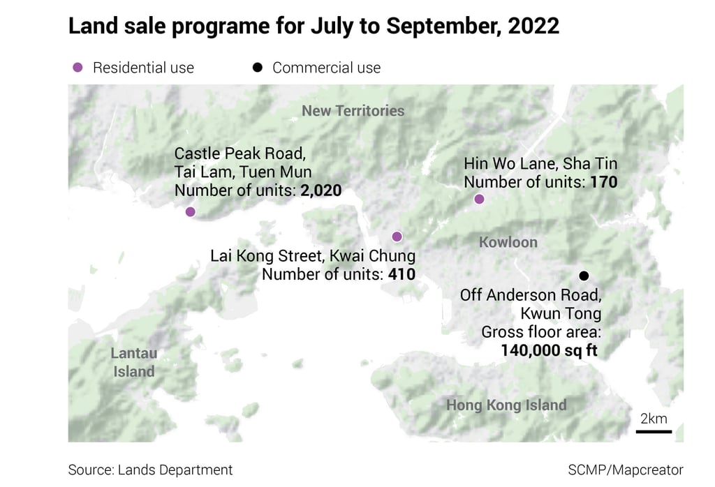 - Government will sell three plots of residential land in Sha Tin, Kwai Chung and Tuen Mun valued by Knight Frank at up to HK$9.1 billion (US$1.2 billion) in the financial second quarter
