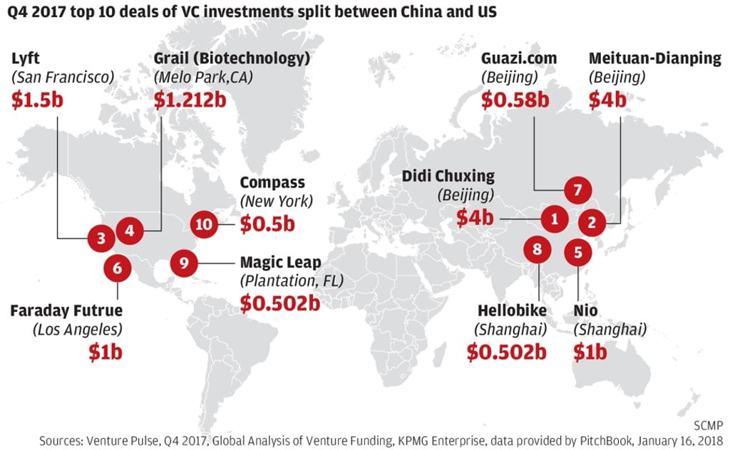 The 10 biggest venture capital deals of Q4 are split evenly between China and the US, KPMG report shows