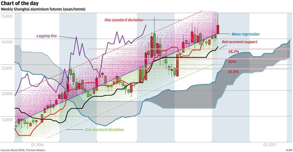 The price of front-month aluminium futures in Shanghai continues to trend neatly higher. Not only is it moving at a sustainable roughly 45-degree angle across the page, but also holding within one standard deviation around the mean regression. The weekly Ichimoku cloud is supportive, as are the moving averages, and the lagging line has been propped up by the upper standard deviation band. Throughout March, the Fibonacci 38 per cent retracement support held the downside, setting off this week’s break through the mean regression line. Expect some hesitation around this point for another week or two, but after that, we will be pencilling in a rally towards the upper one standard deviation line.