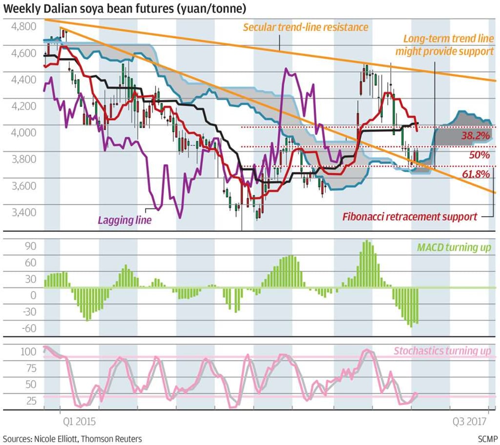 Dalian soya bean futures have had a torrid time this year, soaring to 4,470 yuan (US$650) per tonne early on, only to slump to a low of 3,635 yuan this week. Not surprisingly, historical volatility is well above the very long-term mean and was almost two standard deviations above it late last year. Given that there were small signs of divergence in MACD and stochastics over the past fortnight, we look for an interim base to form. This is because the drop from secular trend-line resistance has retraced a Fibonacci 61 per cent of the previous rally and this area coincides with a rising Ichimoku cloud. The lagging line might also benefit from the sharply rising candles of 26 weeks ago.