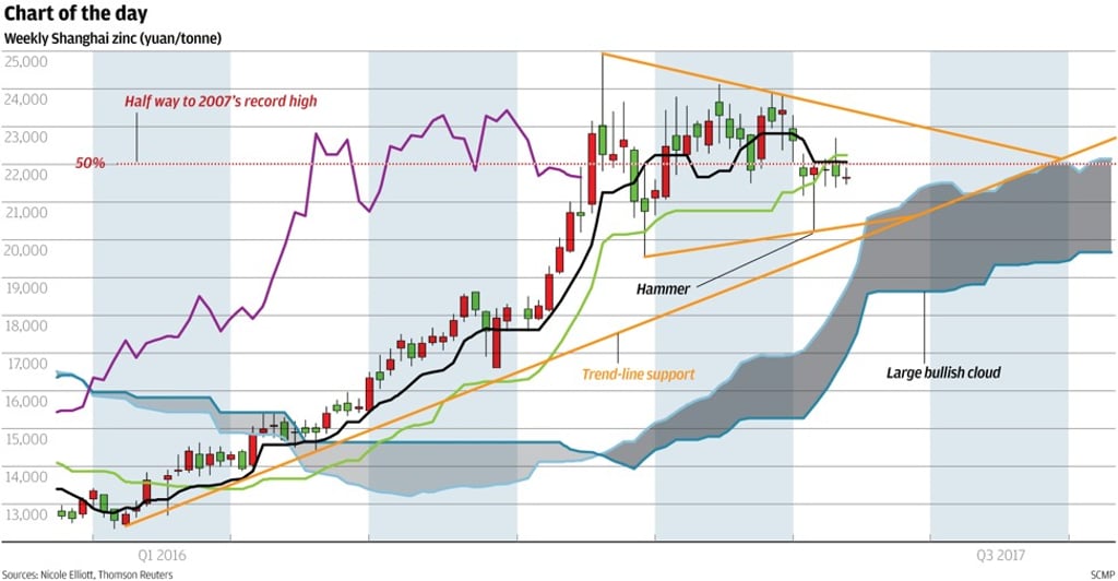 Since late last year the price of zinc on Shanghai’s Futures Exchange has seen some wild swings. What had been a right-angled triangle has morphed into a symmetrical one around to 50 per cent retracement level. Volume has been higher than average, open interest rising steadily, and observed volatility, while lower than in April, is one standard deviation above the long-term mean. This, coupled with a large supportive Ichimoku cloud, means that our bullish stance has not altered. If anything this year’s consolidation has put the market back closer to its long-term trend and likely to move at a more sustainable pace. Our upside targets remain at 27,000 and 28,650 yuan per tonne.
