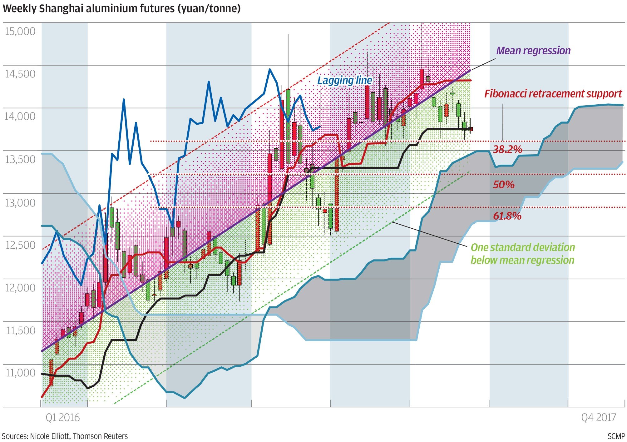 Price action in Shanghai aluminium futures has been quiet for most of this year, so not surprisingly both volume and historical volatility have dropped. This might be a good thing, giving both producers and consumers a chance to benefit from stable conditions. However, all aspects of this weekly chart continue to point to higher prices in the second half. Moving averages and the Ichimoku cloud are clearly bullish, the angle of the latter mirroring that of the mean regression – and well within one standard deviation of it. Both the lagging line and current prices have been propped up by the first Fibonacci retracement support and the blue line might benefit from rising candles over the next five weeks.