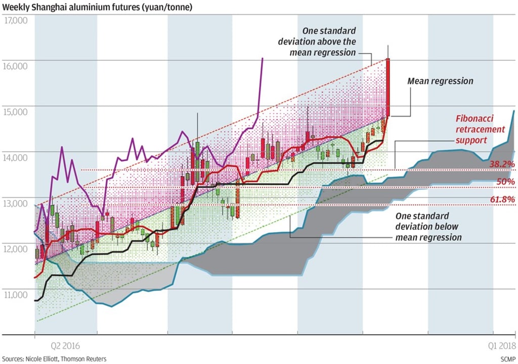 As we wrote in June, the most active aluminium contract (for October delivery) on the Shanghai Futures Exchange this week burst through the mean regression. Very good volume, rising open interest and forward prices in contango to July 2018 suggest many believe the outlook for this base metal is rosy. While the long-term picture remains positive, with all aspects of the weekly Ichimoku cloud chart system being bullish (as are long-term moving averages), we would tread carefully over the next few weeks. The market is more overbought than it has been in three years and it has stalled at one standard deviation above its mean regression, suggesting time for consolidation.