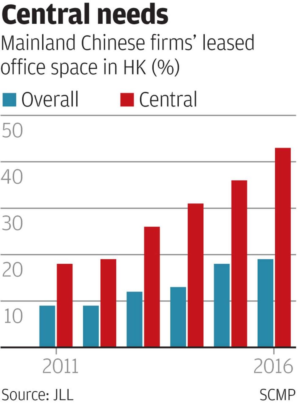 In the first two months of 2017, the property agent has been asked to secure about 150,000 square feet of office space in Central for mainland corporates, representing 40 per cent of the total amount leased in the whole of last year.