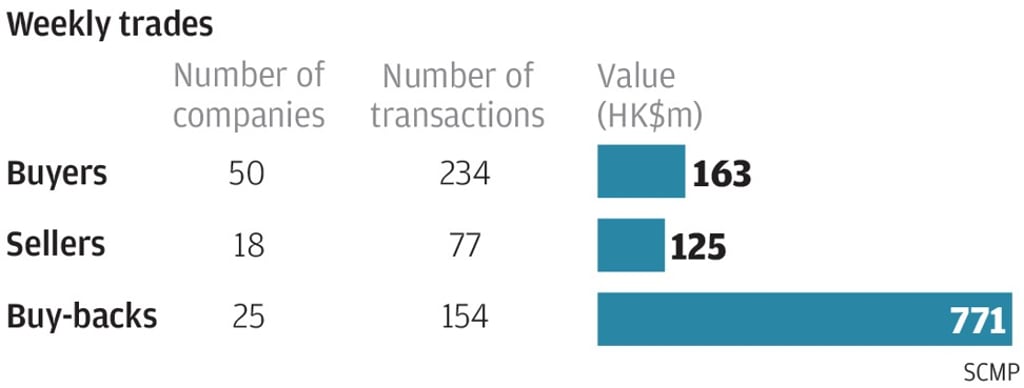 Insider activity rose last week, with 50 companies recording 234 purchases worth HK$163 million versus 18 firms with 77 disposals worth HK$125 million.