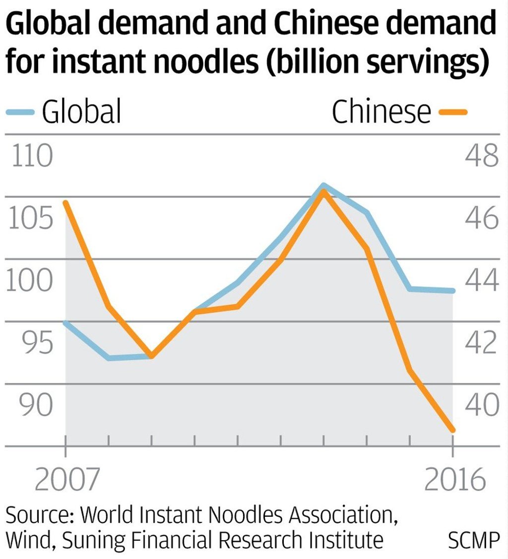 China’s demand for instant noodles declined 17 per cent to 38.5 billion servings in 2016, from 46.2 billion servings in 2013, according to statistics from the World Instant Noodles Association.