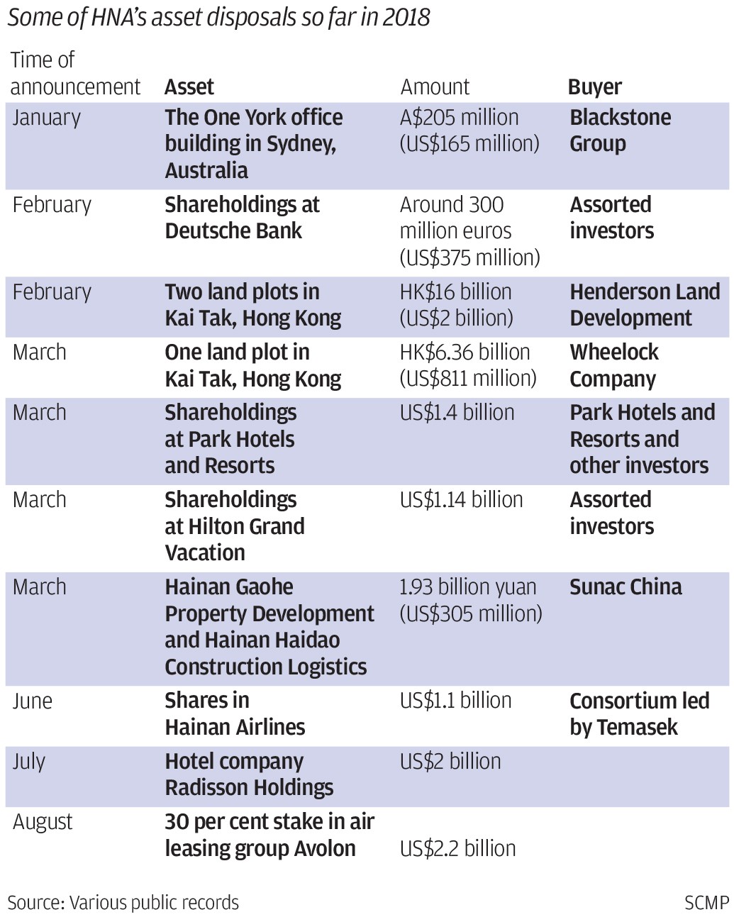 Chinese companies including HNA, Anbang Insurance Group and Dalian Wanda Group have been unloading assets in recent years after attracting government scrutiny because of the financial risks associated with their debt-fuelled expansions. HNA’s asset sales alone have exceeded US$20 billion since 2018, while the founder of Anbang – a firm temporarily seized by the government last year – is now serving jail time.