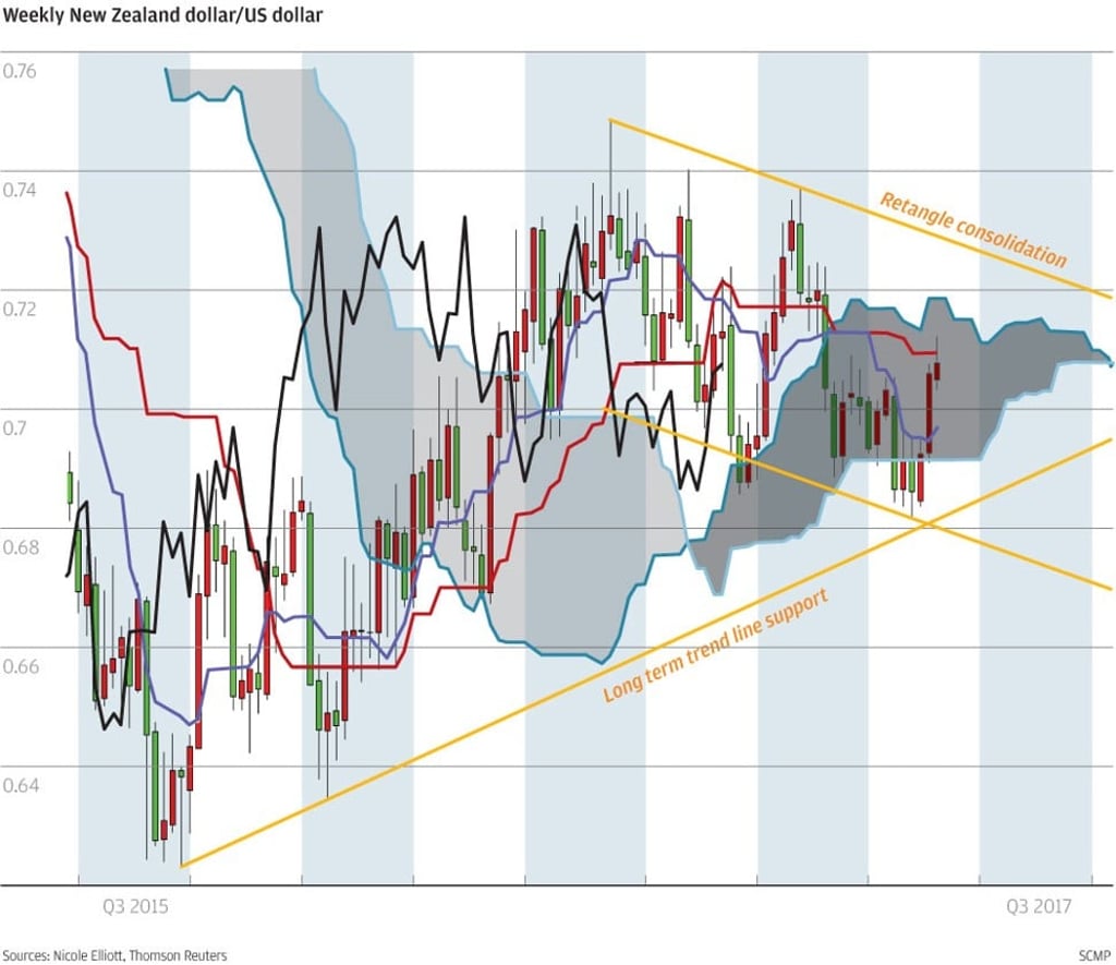 Foreign exchange dealers call the New Zealand dollar a kiwi after the little bird native to that country. In a Thomson Reuters poll of 56 currency analysts published on Friday, they raised their long-term forecasts for it against the US dollar, mainly on a more favourable outlook for commodities and especially milk which is their biggest export earner. Worth noting too that the Reserve Bank of New Zealand’s target interest rate is 1.75 per cent – considerably higher than those of other nations. It has rallied 3.5 per cent in the past three weeks, partly to catch up with other major currencies. A break above the top of the weekly cloud should trigger a squeeze up to the top of rectangle consolidation.