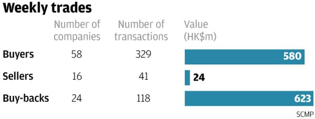 Buying rose for the third straight week as 58 companies recorded 329 purchases worth HK$580 million (US$74.29 million)