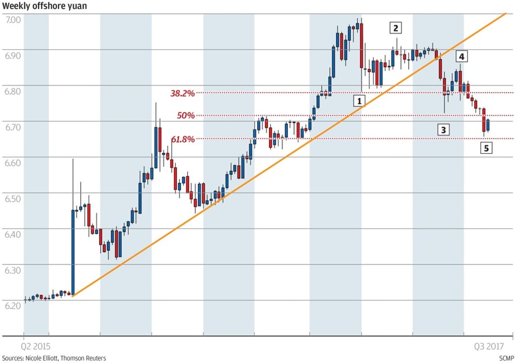 From a record high in the first week of January the US dollar has steadily lost ground against the offshore yuan ever since – despite US President Donald Trump’s promise to make America great again. The move is mature, has retraced a Fibonacci 61 per cent of the previous rally, and maps out as a five wave move where the fifth wave is the same height as the first one. Interestingly waves two and four are similar in size, suggesting this has been an orderly, controlled move. Last week the greenback became more oversold than it has been since January 2014, adding to our view that this lengthy move is close to an end so expect a climb back up to the 6.8900 area.