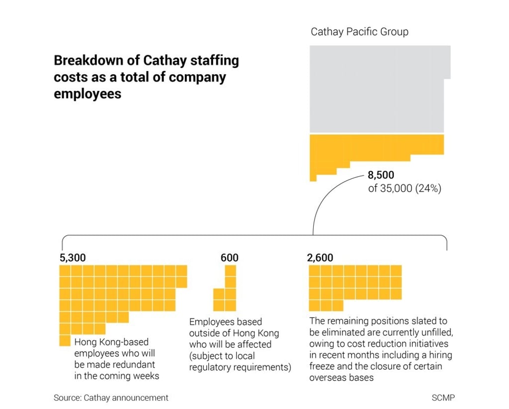 The nearly 6,000 staff laid off by Cathay Pacific Airways under a restructuring decision included around 2,000 cabin crew and about 550 pilots working under the Cathay Dragon brand, while across the group the job cuts affected 4,000 cabin crew and 600 pilots.