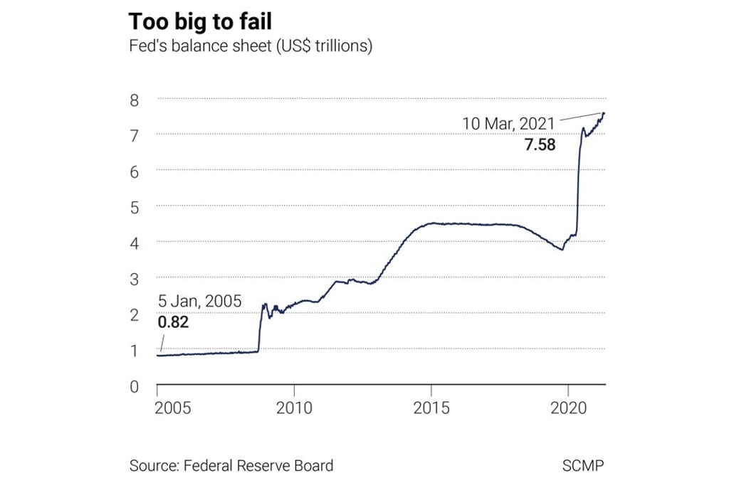 In 2020, four major central banks added US$7.8 trillion in quantitative easing and, according to the Institute for International Finance (IIF), governments of the top 61 major economies expanded debt to 105 per cent of gross domestic product – from 88 per cent in 2019 – an increase of US$12 trillion, in response to the Covid-19 pandemic.