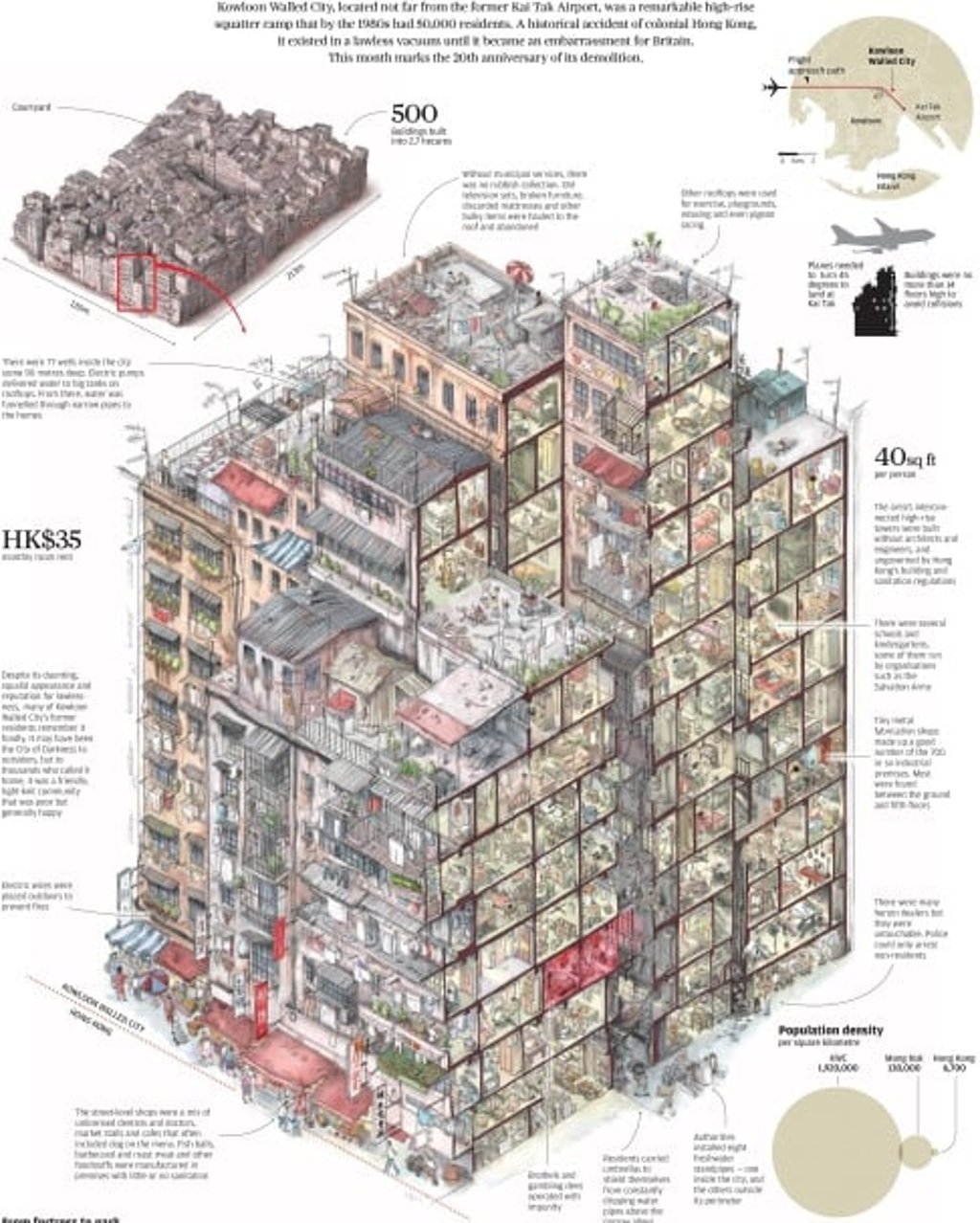 Kowloon Walled City, situated next to the old Hong Kong International Airport, was an incredible megablock of urban/architectural configuration occupying an area of approximately 200 by 150 metres. Most of the 500 buildings in the City, housing almost 50,000 residents, were built between 1965 and 1985. This March marks 20 years from their demolition.