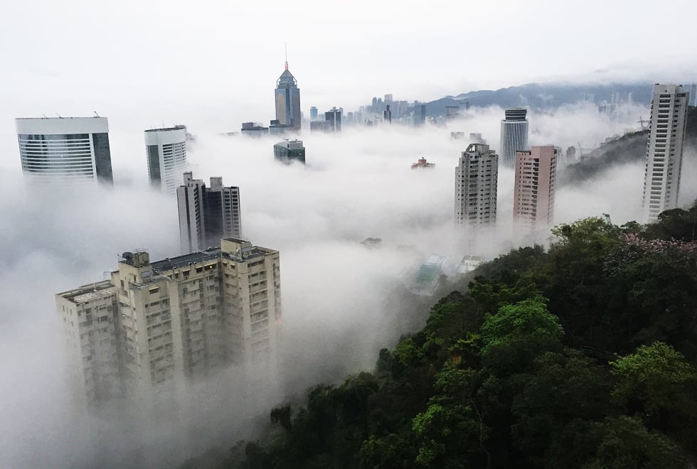 Only the highest skyscrapers could be seen as the fog descended on the city on Monday, caused by a humid maritime airstream affecting the south China coastal areas