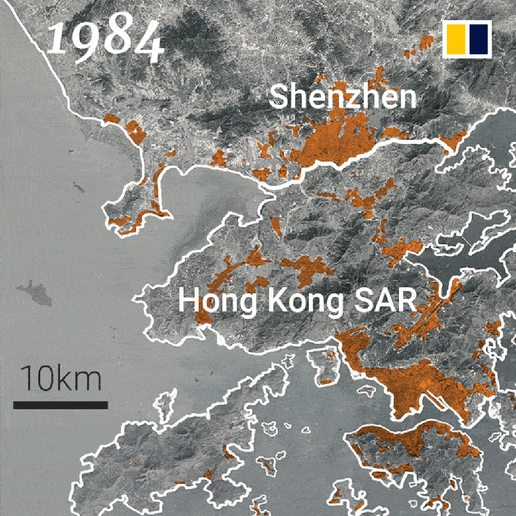 These satellite images show how urban development evolved in the two cities over four decades