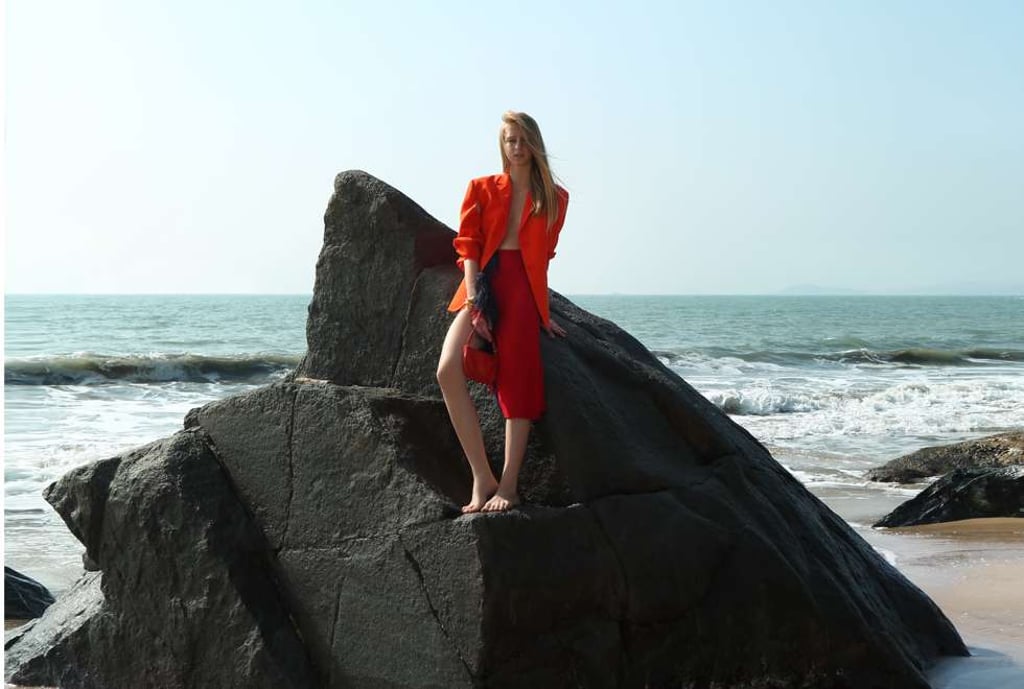 Silk blazer (HK$12,700) by Ports 1961. Silk skirt with feather detail (HK$10,800) by Prada. Gold cuffs (HK$6,700 each) by Louis Vuitton. Mini leather pouch (HK$10,500) by Céline.