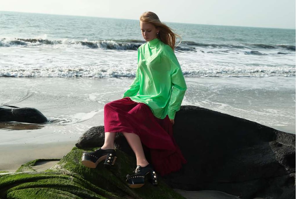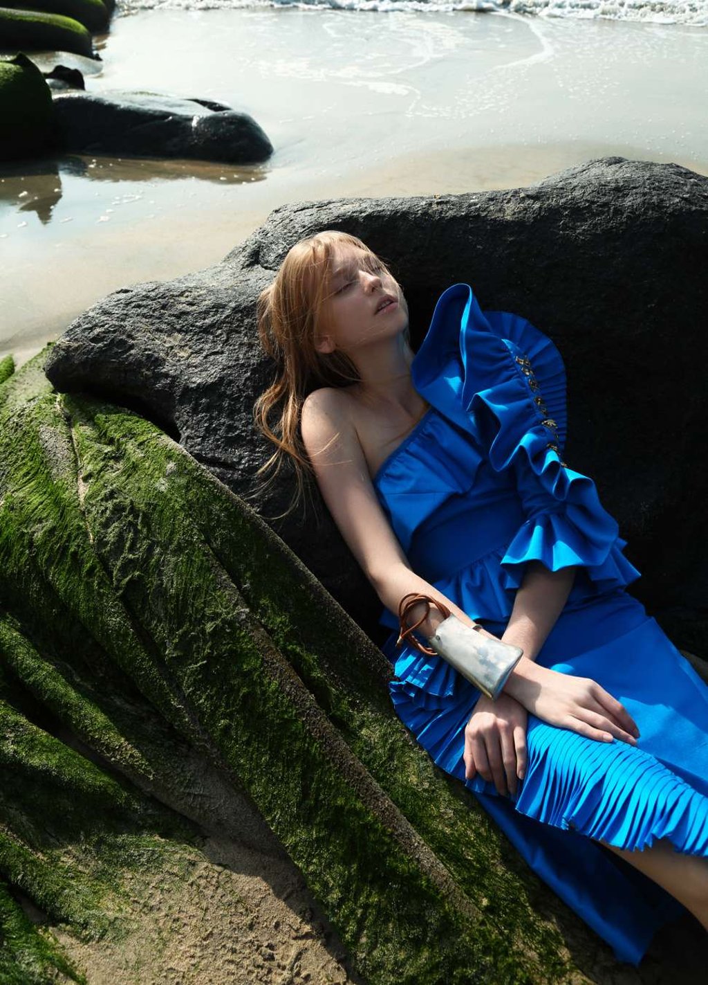 Dress (HK$18,000) by Céline. Platform moccasins by Gucci (inquiries: 2524 4492). Earring (HK$2,900) by Loewe.