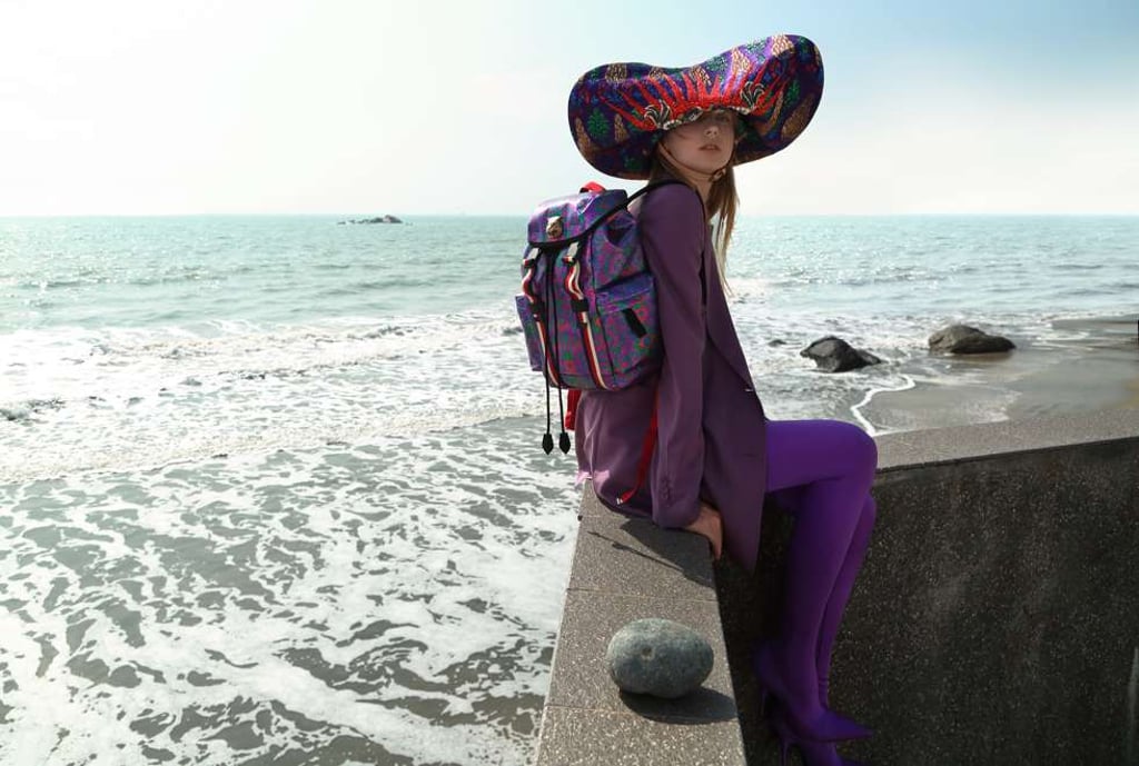 Pineapple pattern jacquard hat with sequins (HK$26,990) and jacquard backpack (HK$14,900) both by Gucci. Purple double breasted blazer (HK$17,600) by Nina Ricci. Purple pantashoes (HK$22,300) by Balenciaga.