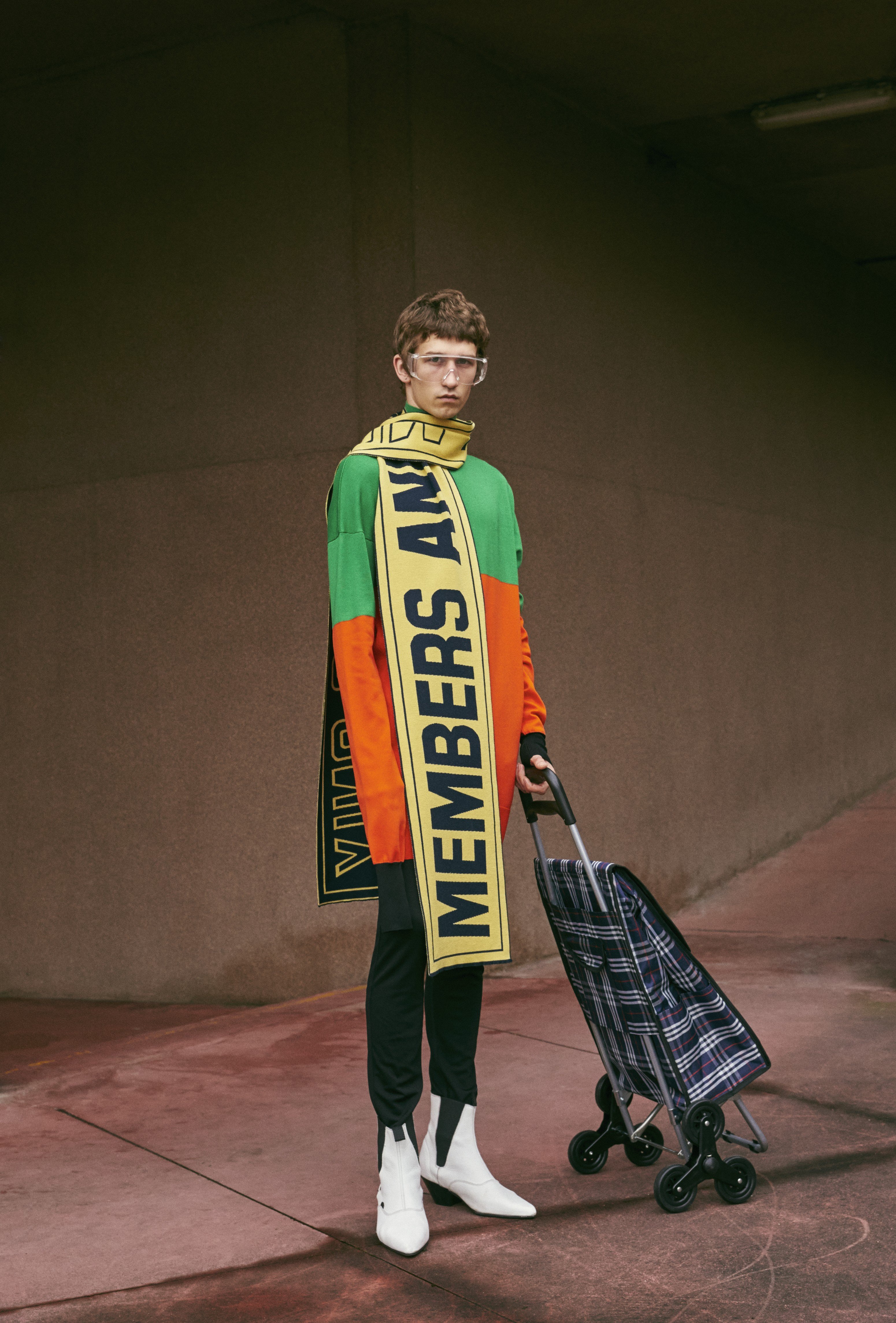 Polo-neck by JW Anderson from Joyce. Trousers (HK$3,400) by Burberry Prorsum. Leather boots (€164) by Underground. Scarf (HK$3,460) by Stella McCartney. Eyewear, stylist’s own.