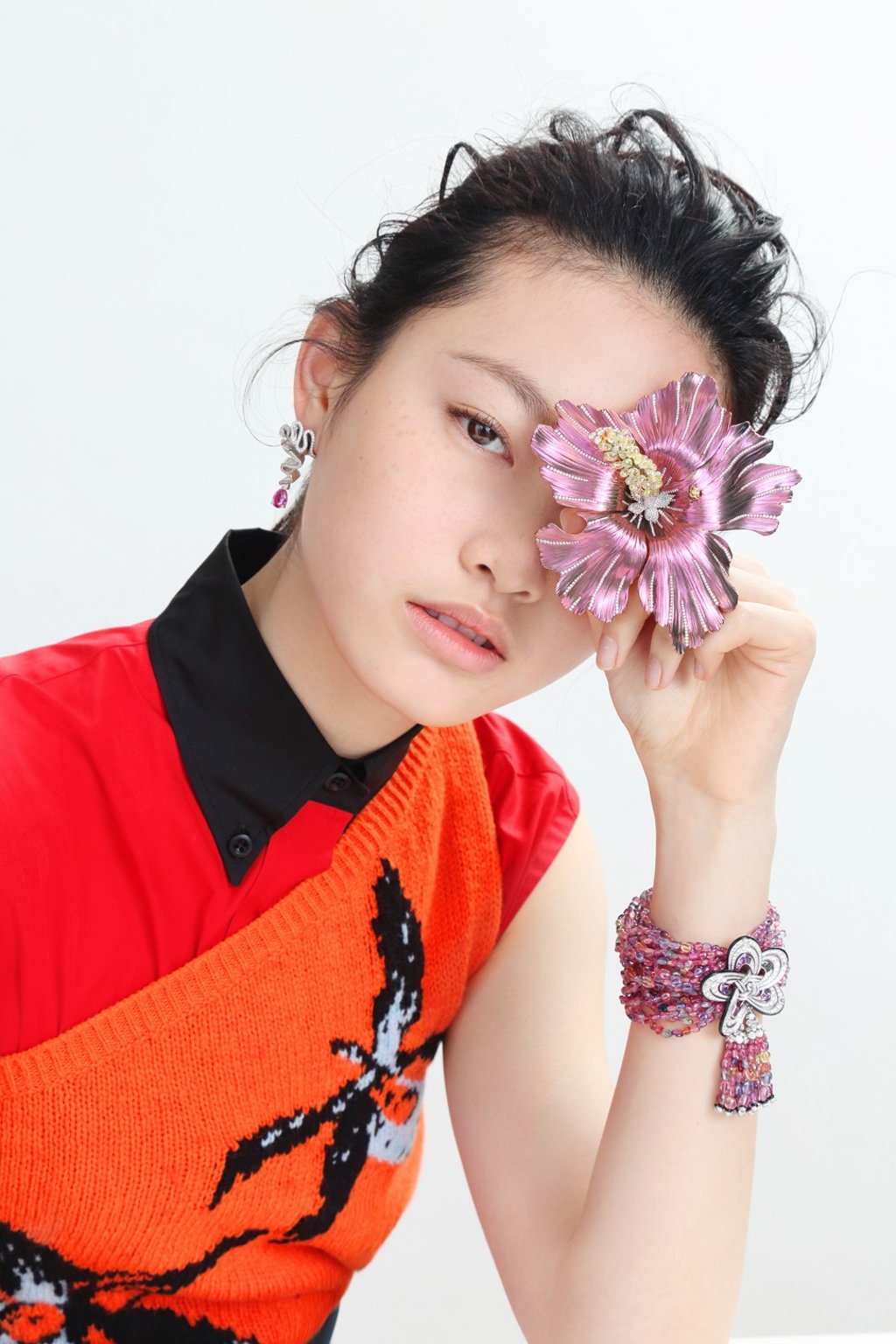 Sleeveless shirt (HK$5,150) and one-shoulder knit top (also HK$5,150), both by Prada. Flower brooch in white gold and titanium with diamonds by Chopard (inquiries: 2973 0611).