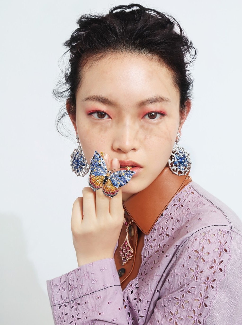 Lace coat with leather inserts (HK$27,650) by Loewe. Earrings in white gold with sapphires and diamonds (HK$5.6 million) by Chanel Fine Jewellery.