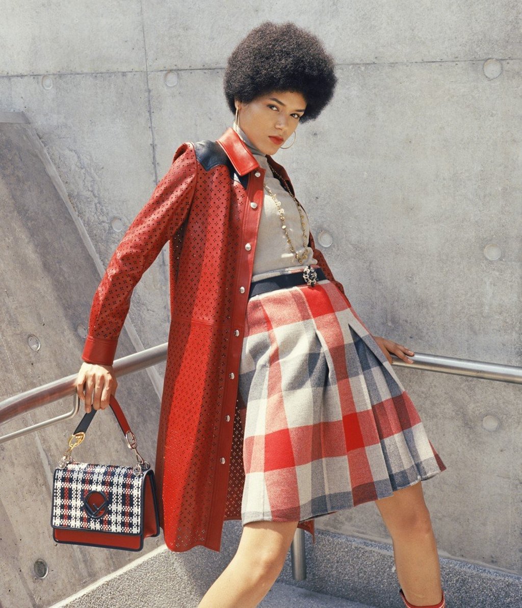 Turtleneck (HK$13,900) by Ralph Lauren. Wool skirt (HK$14,950) by Bottega Veneta. Leather trench coat (HK$62,000) by Louis Vuitton. Kan I bag (HK$19,800) by Fendi. Belt (HK$23,600) by Chanel. Necklace with antique gold finish (HK$7,200) by Dior. Hoop earrings (HK$14,150) by Gucci.