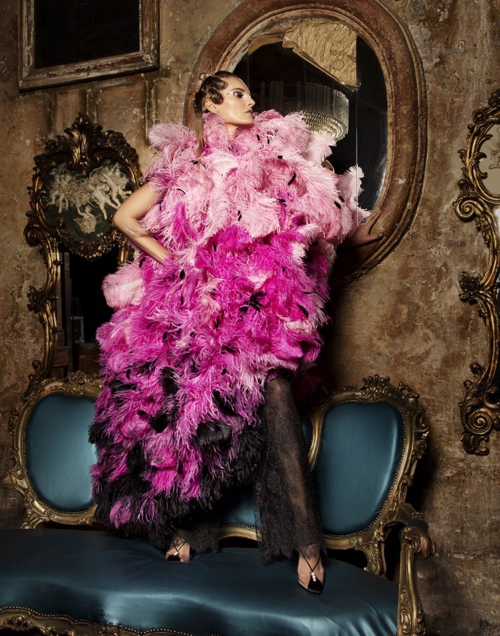 Cape with feathers, lace trousers and shoes, all by Armani Privé.