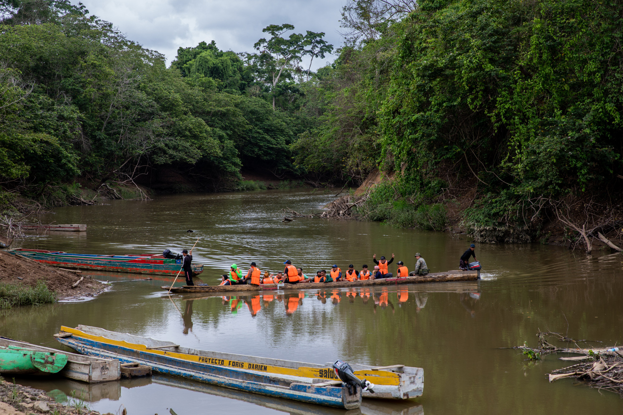 As the morning fog lifts over a river cutting through dense jungle in Panama, a small wooden boat with loud engines breaks the calm. On board are migrants clad in life jackets.