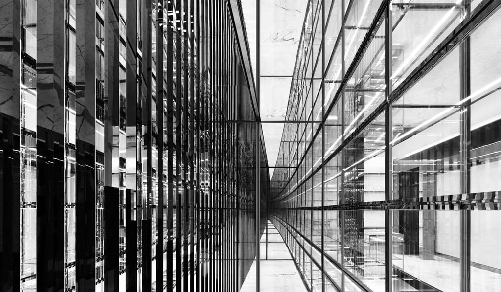 Bringing guests into a world of marble, brass and glass, the three-storey store is covered in black and white marble walls and floors with structures in nickel-plated brass, extra clear glass and gold frame showcase.