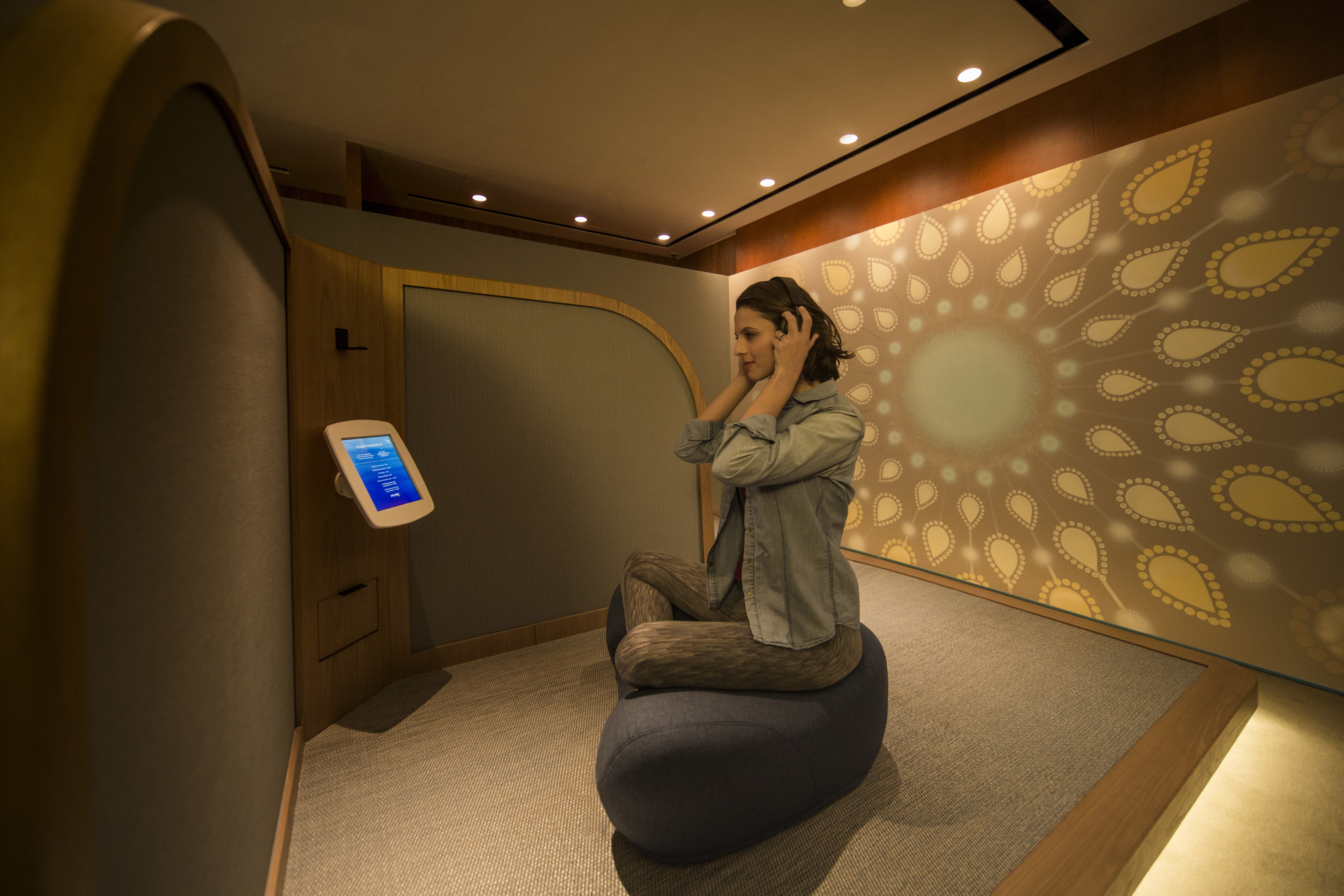 Travellers can practise yoga or meditate in two areas focused on the body and mind in the carrier’s business class lounge at Hong Kong International Airport