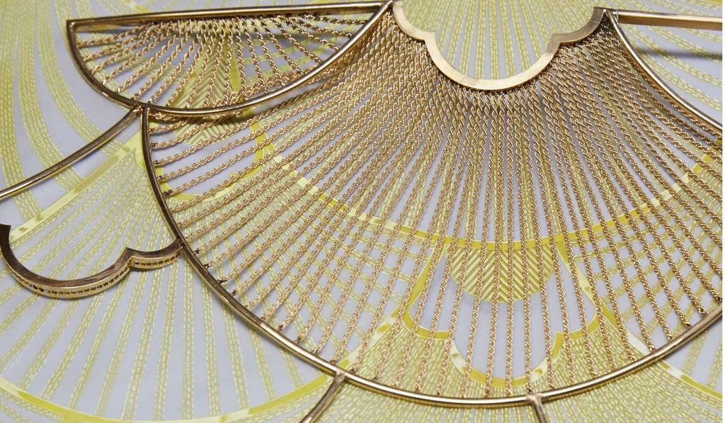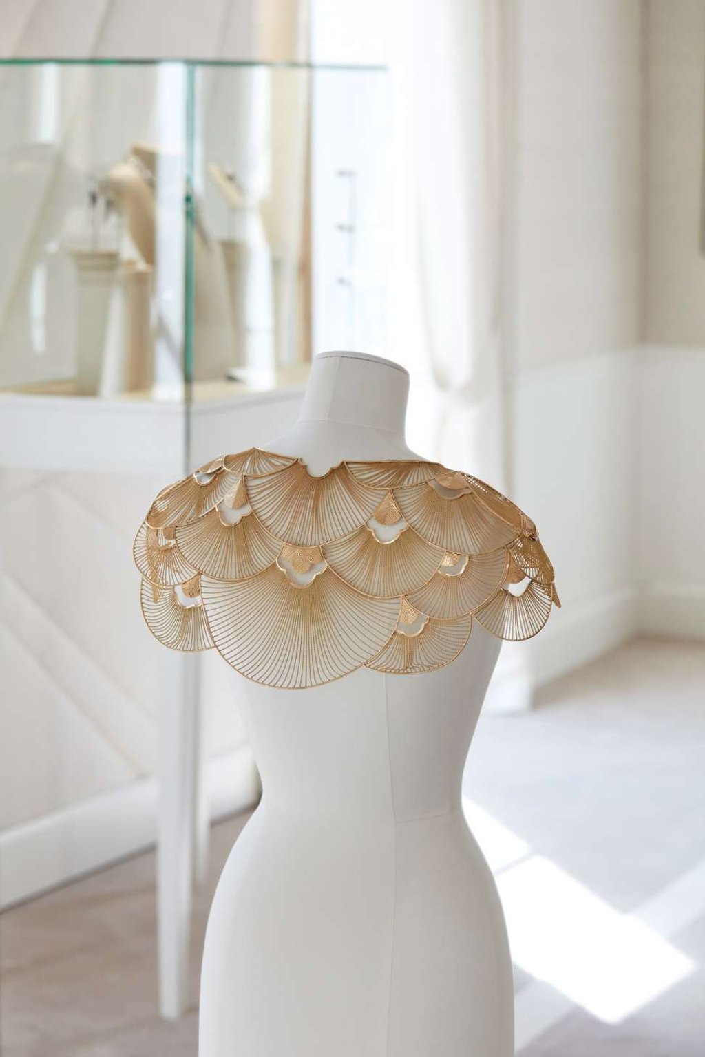 The whole production process is carried out on a Stockman dummy, ensuring that the metal work will be supple enough to fit and drape perfectly on human shoulders. The craftsmen give the same attention to detail with this piece as they do with an haute couture clothing piece. The template alone requires 70 hours of work.