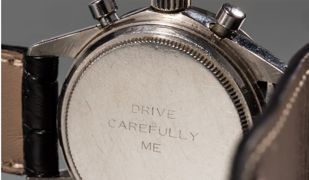 The significant timepiece has the message “Drive Carefully Me” engraved on the caseback. The sweet inscription was left by Joanne Woodward, Newman’s wife and co-star of Winning (1969), in which Newman played racecar driver Frank Capua.