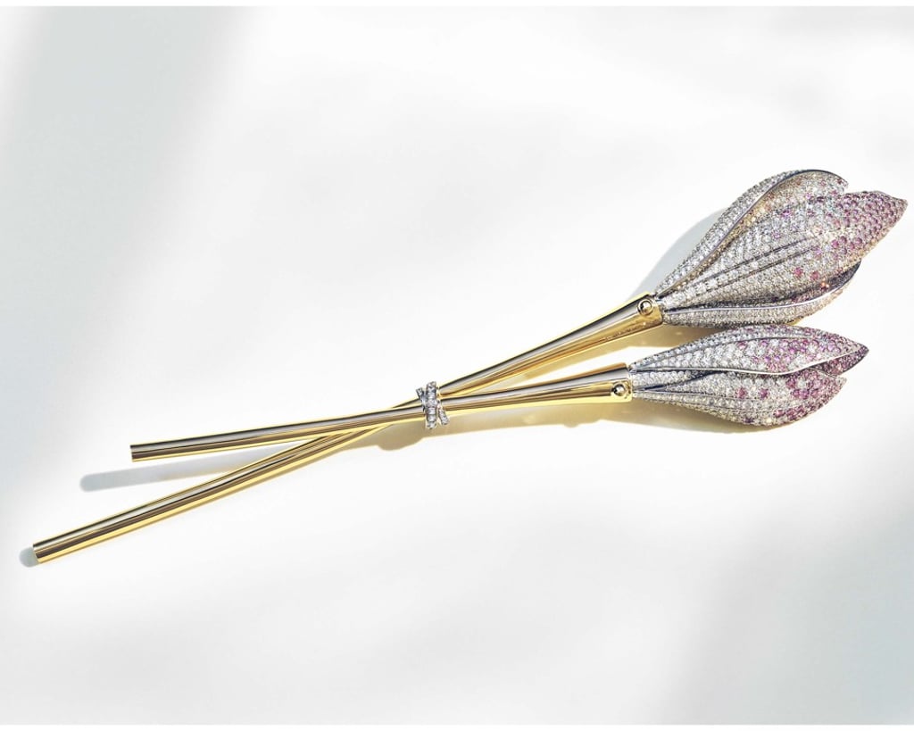 Tiffany & Co. This flora-inspired brooch, in 18ct yellow gold and platinum with round pink and white diamonds totalling over 8ct, comes from the brand’s latest Blue Book collection.