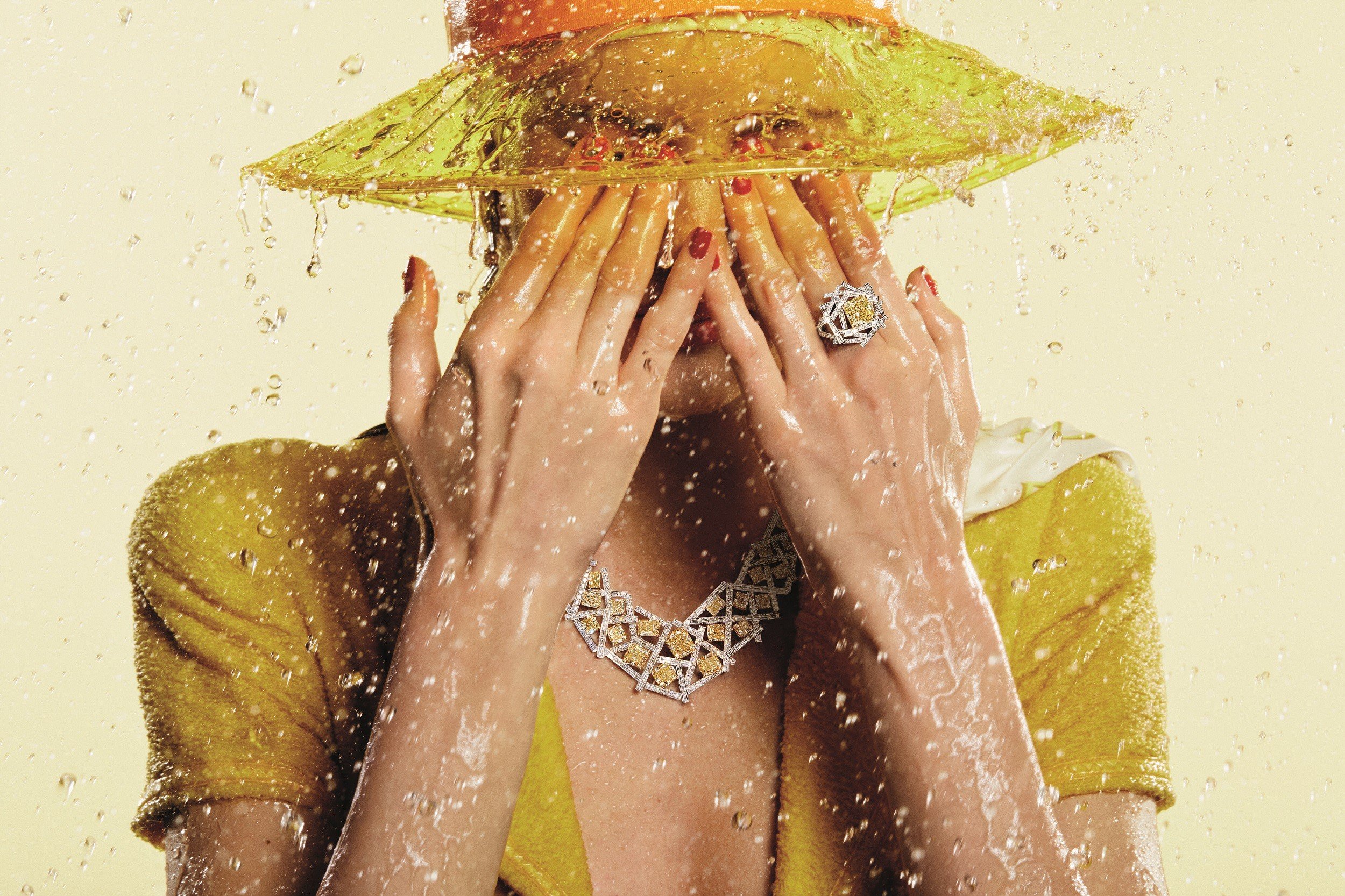 Princess- and emerald-cut diamonds, white or yellow, are nested within a lattice of white baguette and pavé-set diamonds, seemingly random but with a stunning graphic effect. A 5.42 carat, radiant-cut yellow diamond is the centrepiece of a ring surrounded by these exquisite threads.