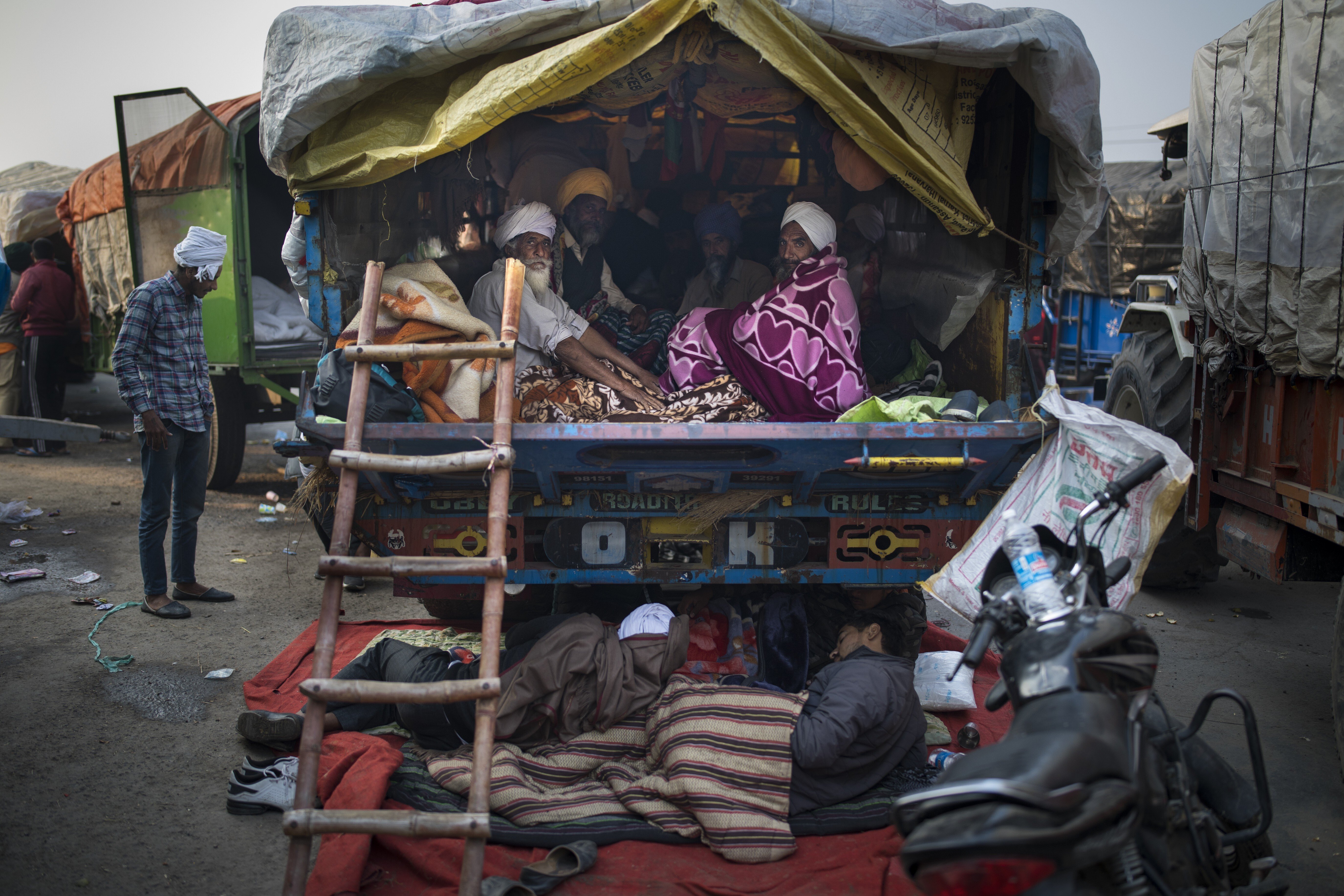 Braving Delhi’s cold winter, the women sleep on a truck bed, bathe on the side of the road and eat food at a makeshift community kitchen.