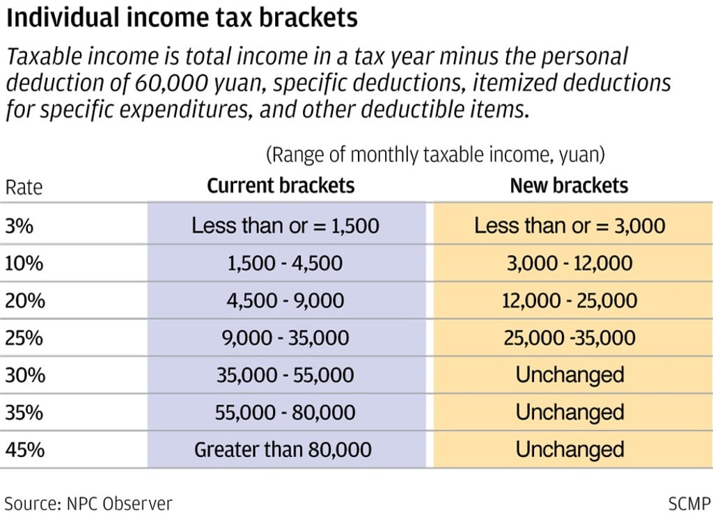 The final bill is little changed from the first draft unveiled in June, with seven tax brackets and a top income tax rate of 45 per cent. The 5,000 yuan per month tax-free threshold was left in place from the first draft despite many demands for it to be raised further.